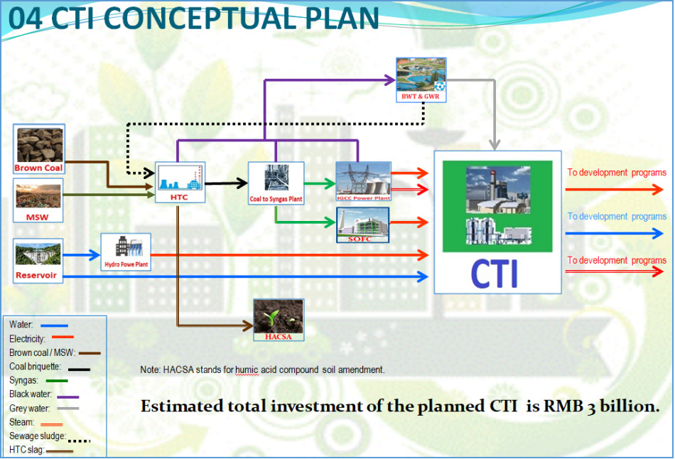 Bitung工業園清潔技術基礎設施平臺(CTI)計劃建設一套水熱碳化(HTC)裝置,每年可處理265萬噸褐煤和城市生活垃圾,并生產106萬噸水焦炭;一個合成氣裝置(利用水焦炭每年可生產26.8億立方米合成氣),可為IGCC發電廠、固體氧化物燃料電池(SOFC)系統和年產48萬噸金紅石的生產線提供合成氣;IGCC發電廠,總裝機為270MW;SOFC混合發電系統,總容量為5MW;一座10MW的水電站和供水設施,可為Bitung工業園區一期提供285MW電力和4500萬立方/年的供水。
